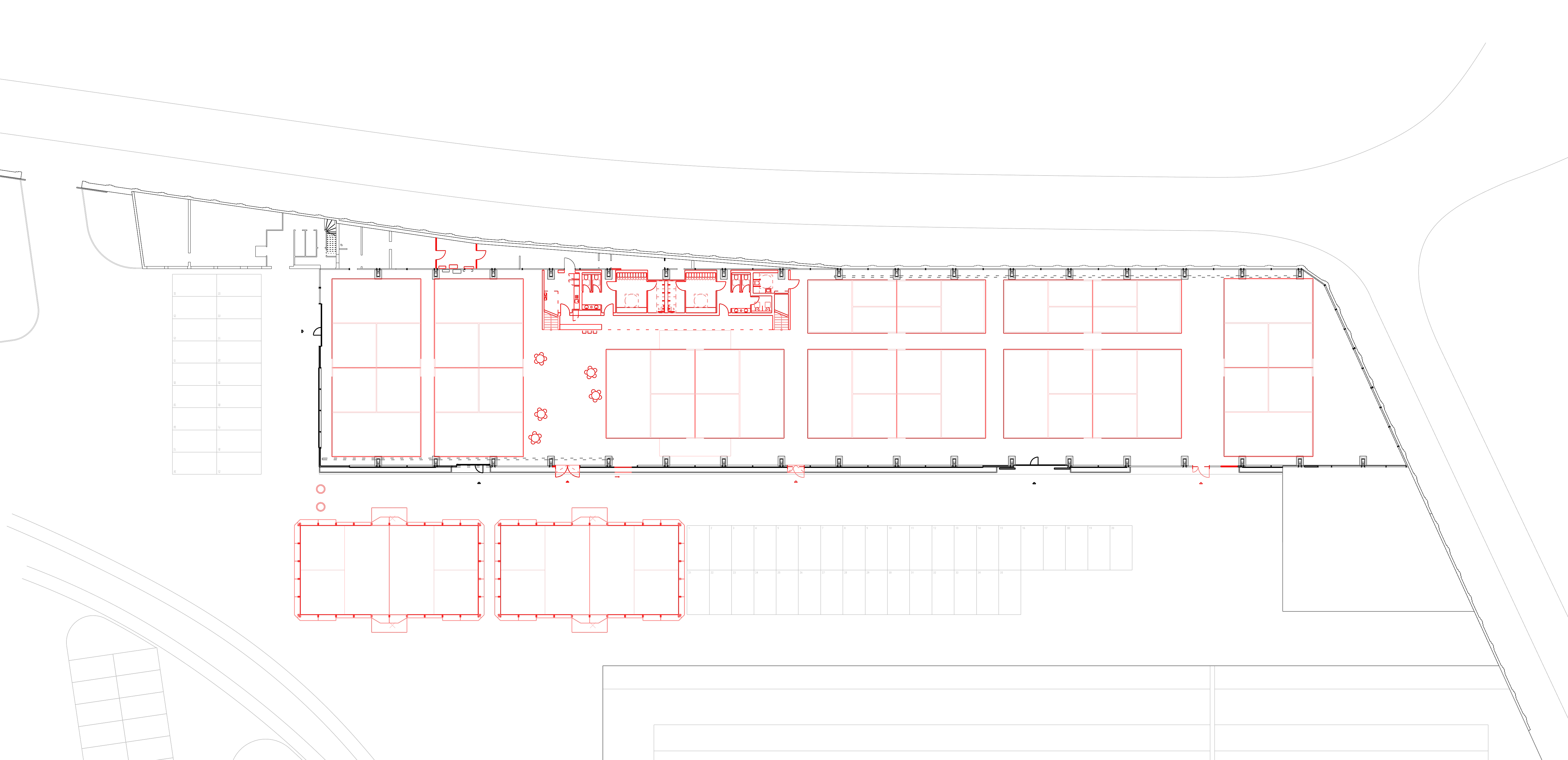 Auf acht Spielfeldern wird man zukünftig in der Aluhalle Padel spielen können. Hierfür planen wir einen Halleneinbau in Holztafelbauweise, welcher eine Bar, Umkleiden und WCs beherbergt. Auf der Dachterasse des Einbaus lassen sich dann künftig die Spiele bei einem kühlen Getränk verfolgen.